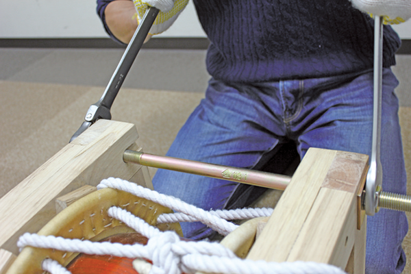 締太鼓の紐を締める補助機です。紐締めはボルトに比べて強く締めるのが難しいですが、この道具を使えばボルト締め並に強く締めることが可能です。※別途24mmのレンチをご用意ください